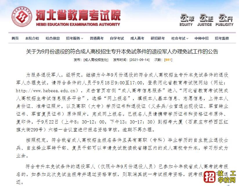 2021年9月退役軍人可享受河北省成人高考免試入學好政策!